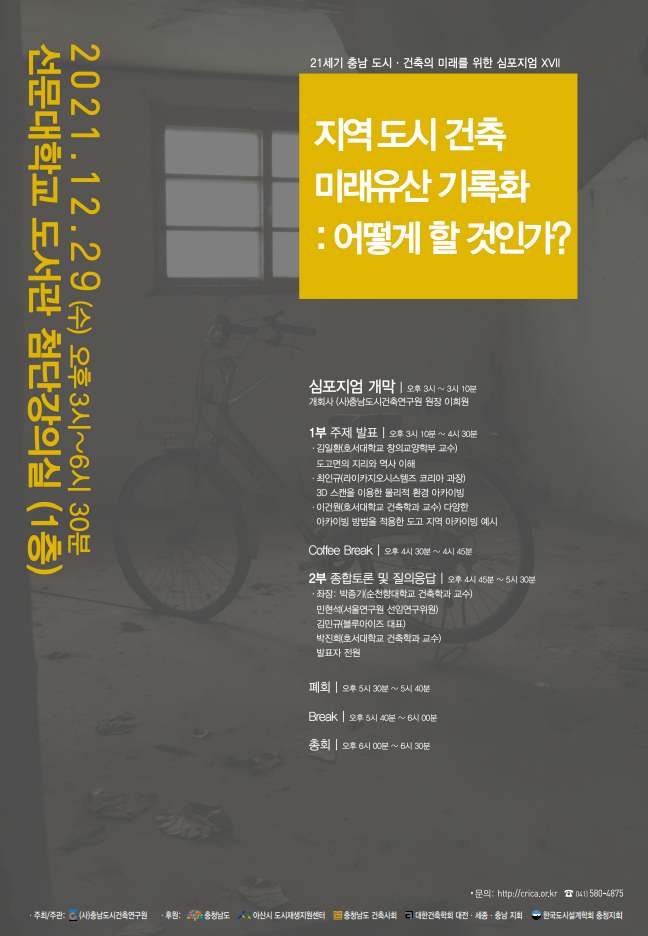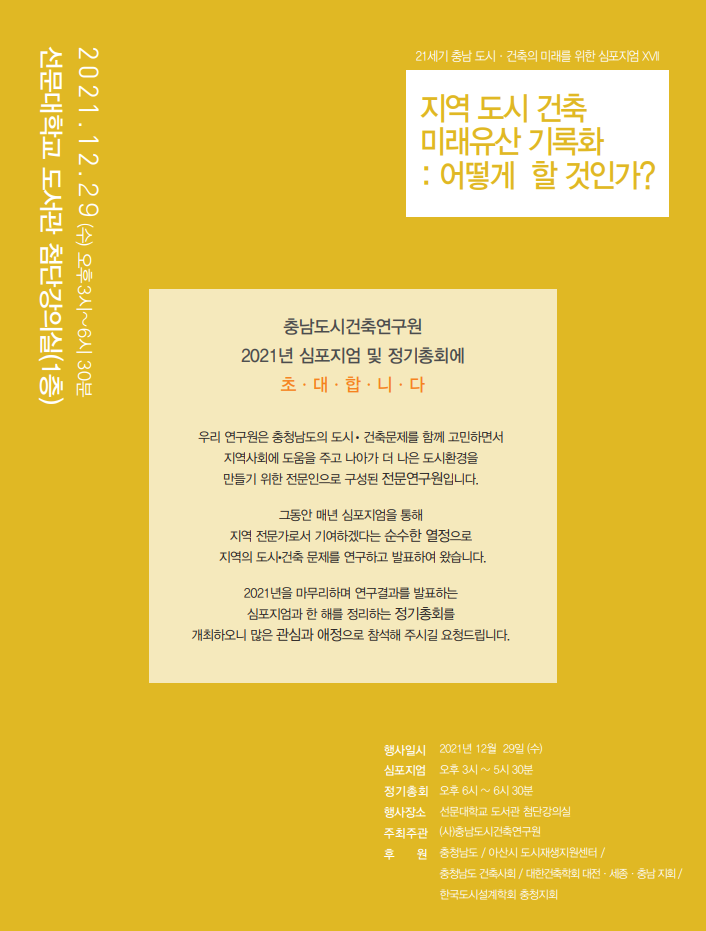 충남 아산시 탕정면 선문로 221번길 70 (사) 충남도시건축연구원 (선문대학교 건축학부 내) I TEL. (041) 530-2320 FAX. (041) 530-2839 I E-mail. heewon@sunmoon.ac.kr I Copyright © 2021 충남도시건축연구원. All Rights Reserved.