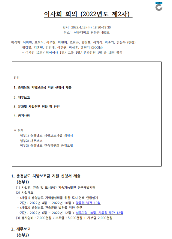 충남 아산시 탕정면 선문로 221번길 70 (사) 충남도시건축연구원 (선문대학교 건축학부 내) I TEL. (041) 530-2320 FAX. (041) 530-2839 I E-mail. heewon@sunmoon.ac.kr I Copyright © 2021 충남도시건축연구원. All Rights Reserved.